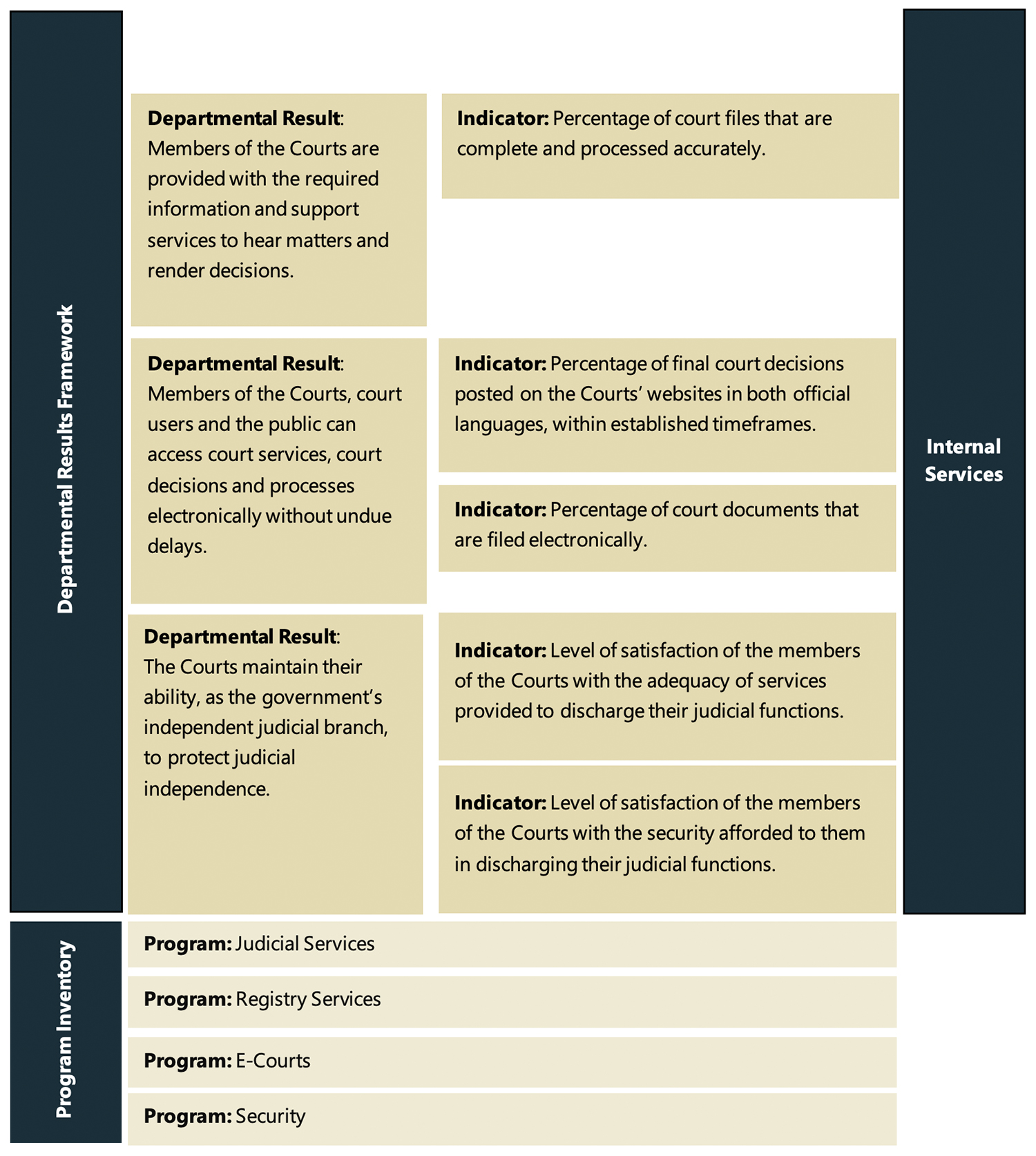 | The Courts maintain their ability, as the government’s independent judicial branch, to protect judicial independence and access to justice. | Level of satisfaction of the members of the Courts with the security afforded to them in discharging their judicial functions. | At least a rating of 4 on a scale of 1 to 5 | March 31, 2022 | Not evaluated Ω | Not evaluated Ω | Not evaluated Ω |