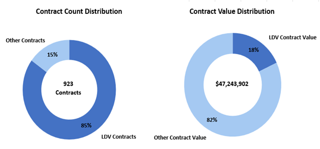 At CAS, LDV procurements account for most of the contracts awarded – approximately 84% of all professional service contracts annually. In 2023-24, 224 out of 267 contracts awarded were LDV, valued at approximately $2.2 million.